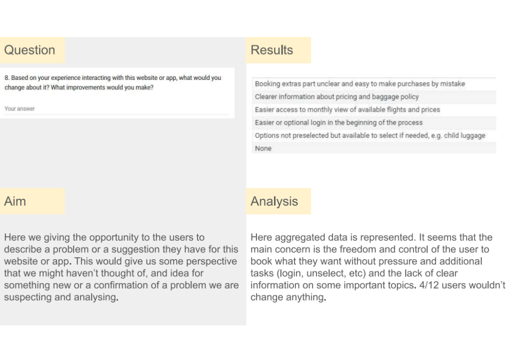 After gathering as much information as possible via an online survey, usability tests and completive benchmarking, it became apparent that the main pain points the users face when booking a flight are mainly unclear information about pricing and baggage policy and unclear functionality of booking extras, sometimes even being preselected adding friction to the users for having to monitor closely and deselect them during the booking process.