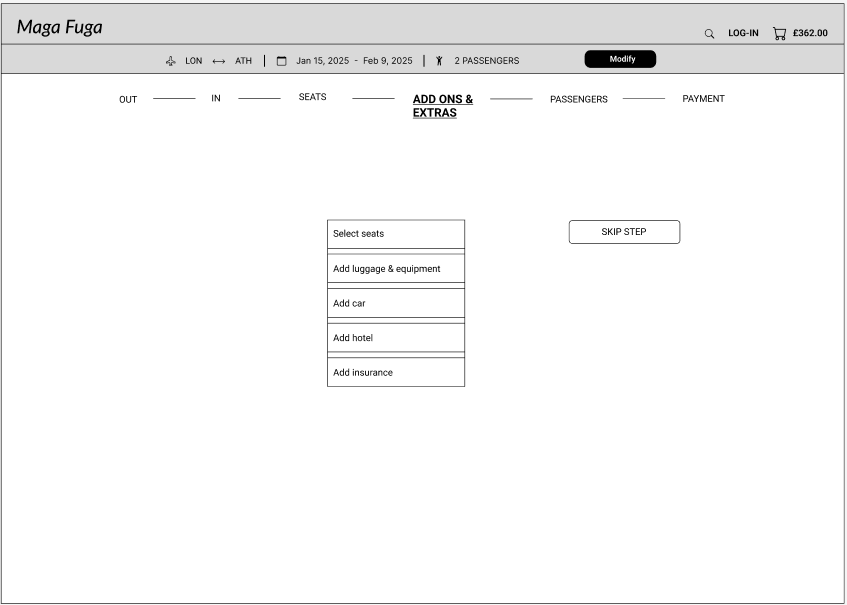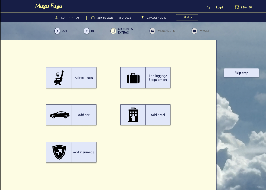 - Luggage and extras are all under one step ‘Add-ons and extras’, that also include the seats selection. If any selected, it becomes a clickable step in the progress bar, so the user can go back to each of them easily at any give time to make a change. Adding the booked extras to the progress bar, it gives an additional clue to the users of what they have already booked without the extra click of visiting the basket.