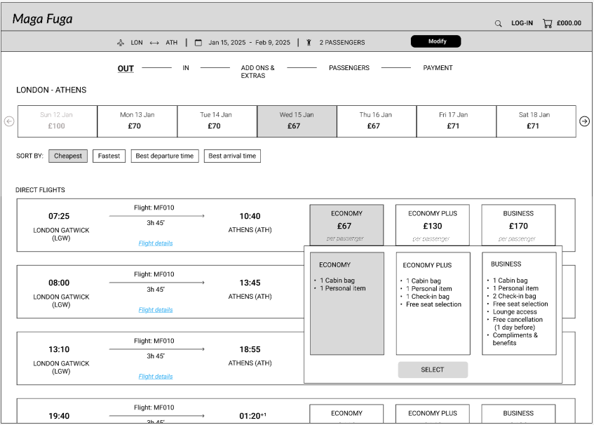 So here I had the issues I wanted to address; my focus should be to improve the experience of the ‘Select fare’, ‘Select luggage’ and ‘Select extras’ steps of the customer journey, that seemed the lowest point of user experience during the booking process.