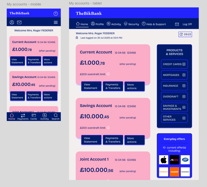 • ‘Current account’ screen: The screen with day to day spendings, including recent transactions, quick links to regular payees, etc.